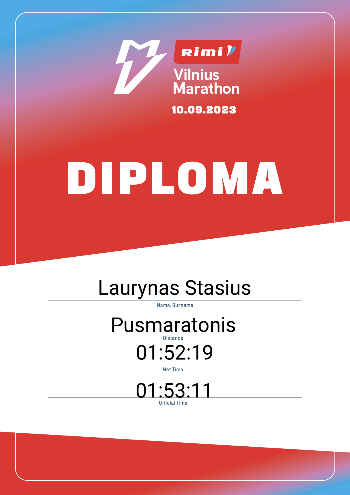 | 734 | Rokas Siraštanovas | 360IT | 13460 | Lithuania | Pusmaratonis | 01:55:23 | Diplomas |
