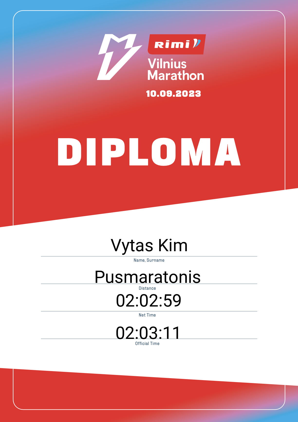 | 1061 | Laimis Kubilius | 13719 | United Kingdom | Pusmaratonis | 02:03:43 | Diplomas | |