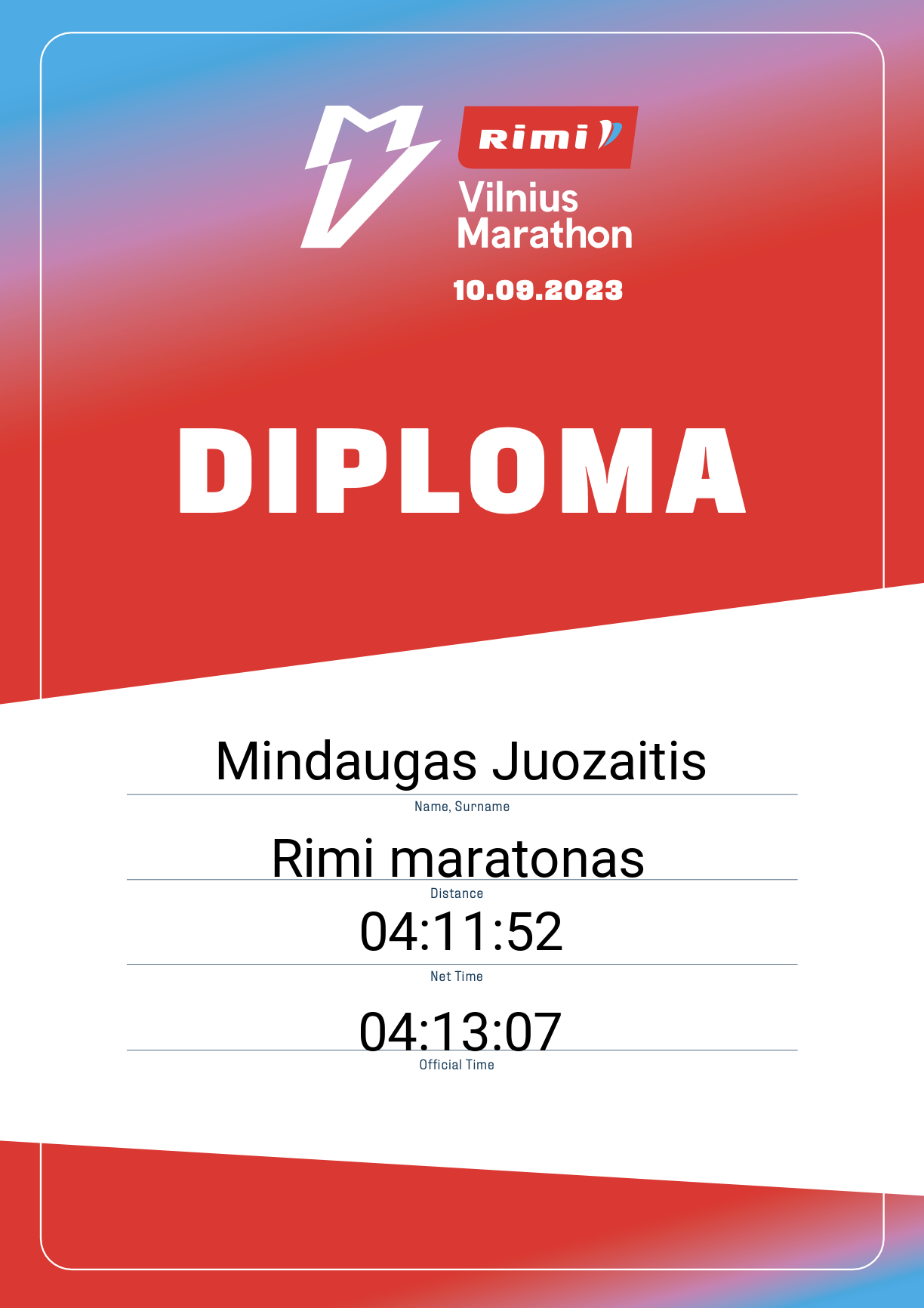 | 530 | Mindaugas Juozaitis | 445 | Lithuania | Rimi maratonas | 04:13:07 | Diplomas | |