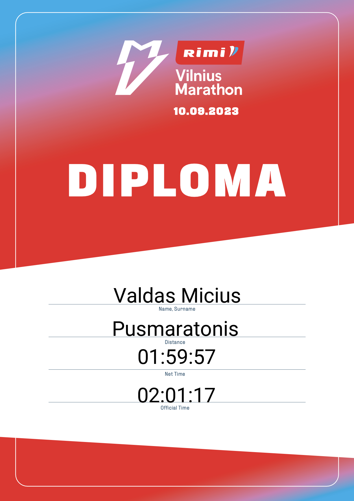 | 960 | Valdas Micius | Ukmergės bėgimo klubas | 14166 | Lithuania | Pusmaratonis | 02:01:17 | Diplomas |