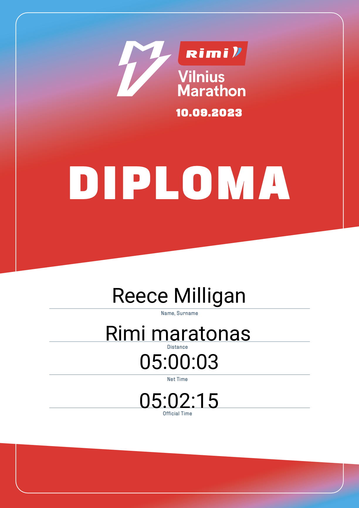 | 843 | Reece Milligan | 514 | Lithuania | Rimi maratonas | 05:02:15 | Diplomas | |