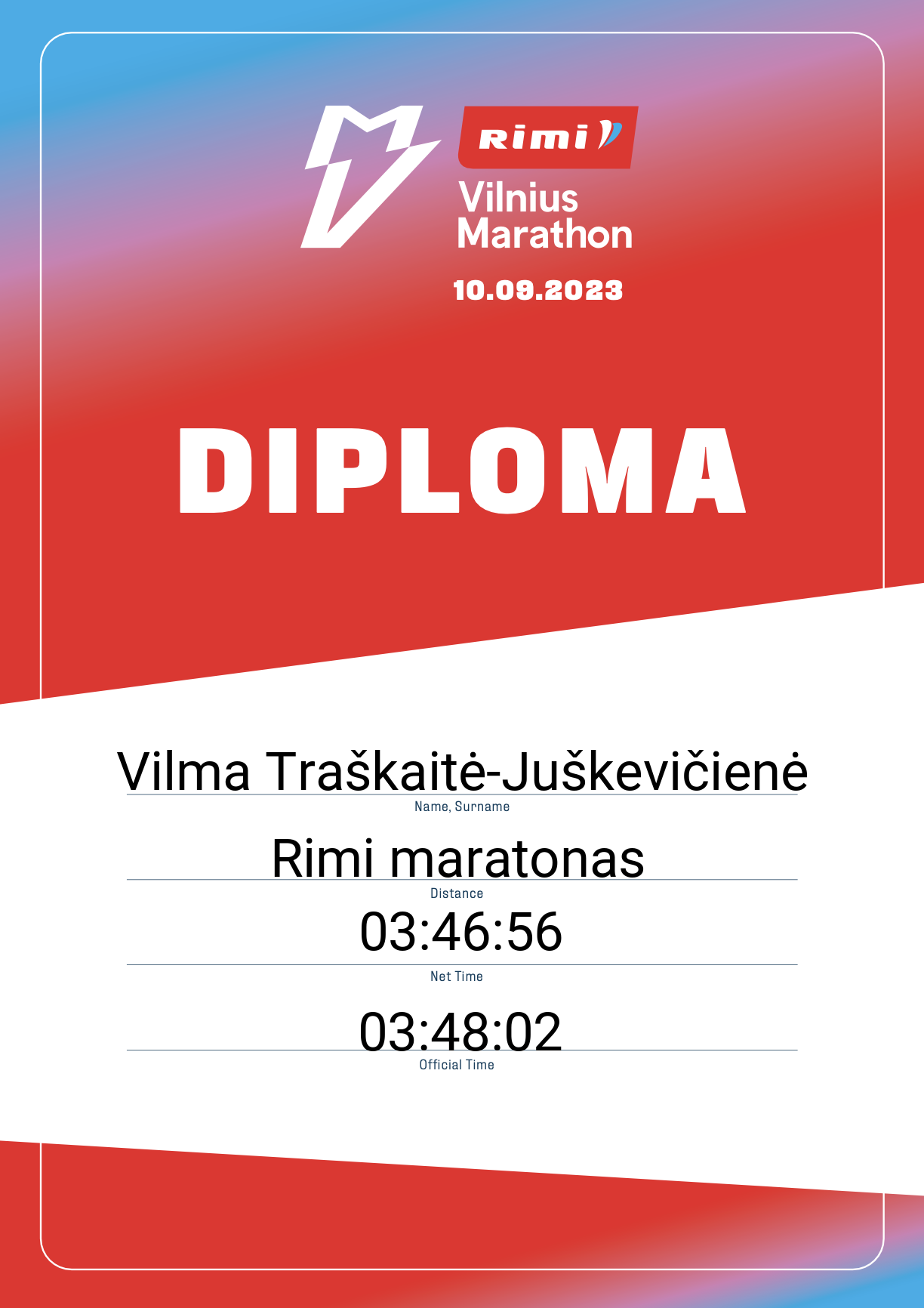 | 294 | Vilma Traškaitė-Juškevičienė | LSMU Kauno klinikos | 645 | Lithuania | Rimi maratonas | 03:48:02 | Diplomas |