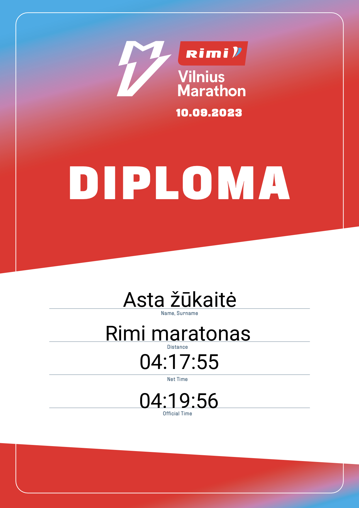 | 575 | Asta žūkaitė | Vyno klubui 20 | 912 | Lithuania | Rimi maratonas | 04:19:56 | Diplomas |