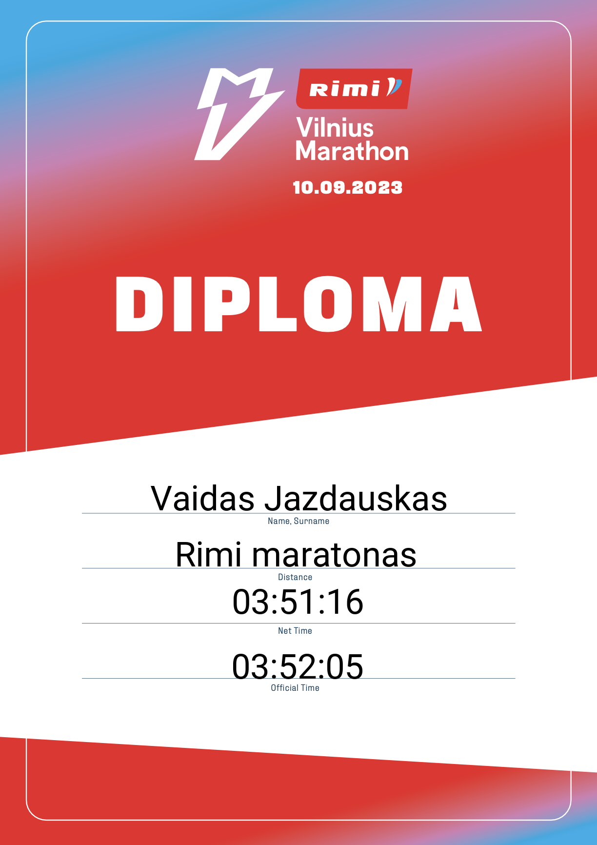 | 332 | Vaidas Jazdauskas | VGTU Turistų klubas | 337 | Lithuania | Rimi maratonas | 03:52:05 | Diplomas |