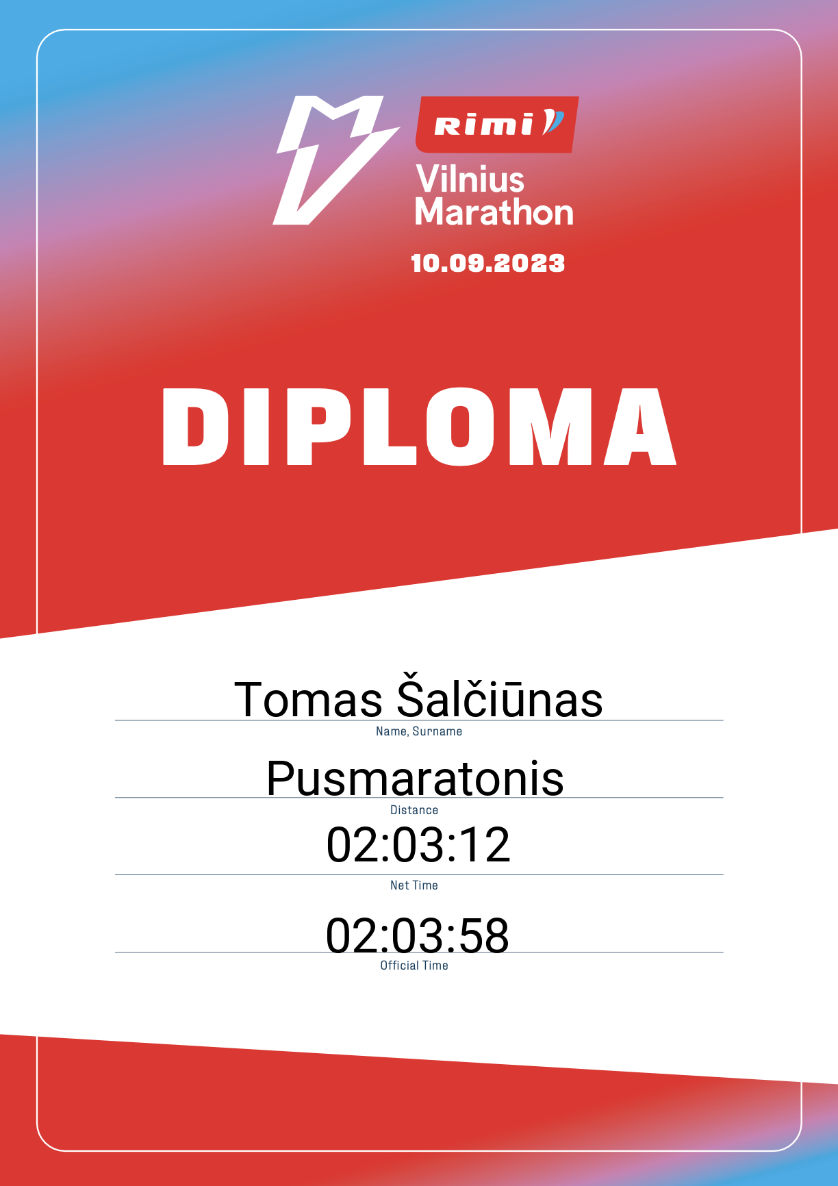 | 1071 | Tomas Šalčiūnas | 12154 | Lithuania | Pusmaratonis | 02:03:58 | Diplomas | |