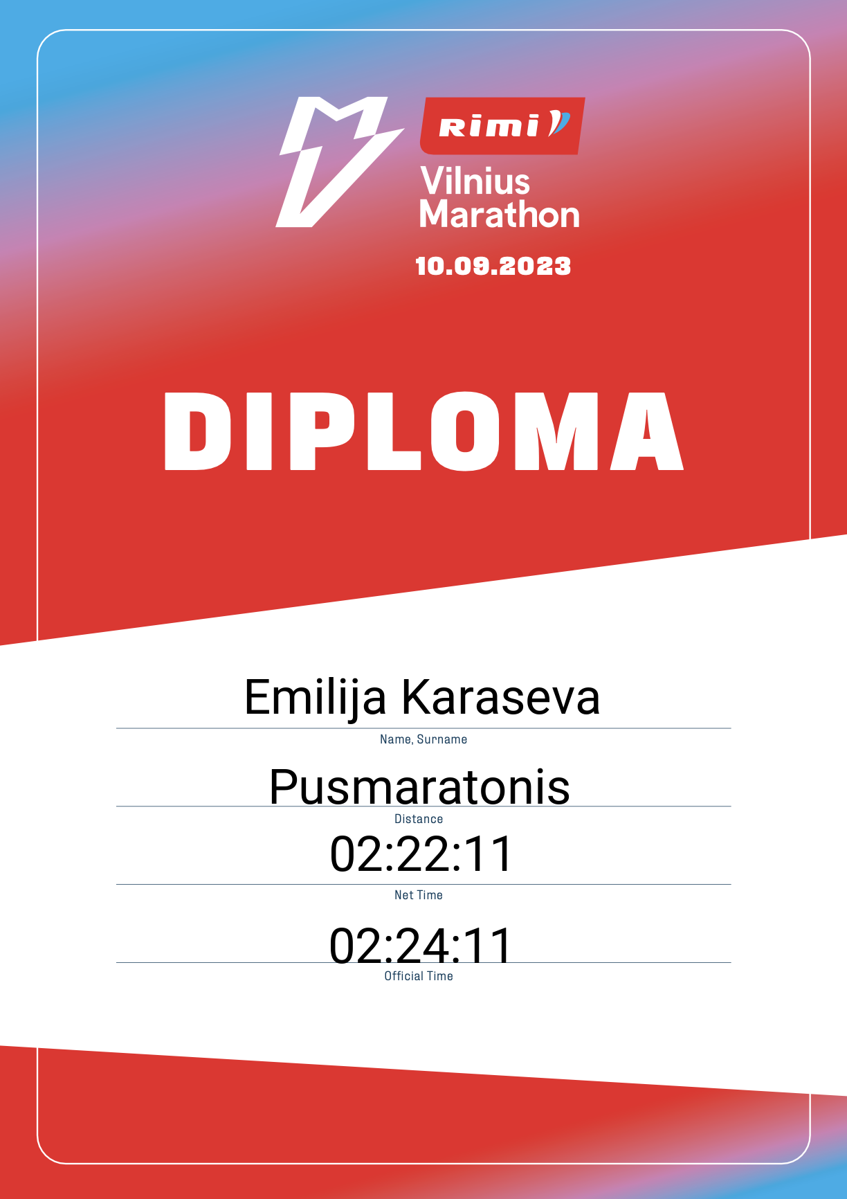 | 1544 | Emilija Karaseva | 12419 | Lithuania | Pusmaratonis | 02:24:11 | Diplomas | |