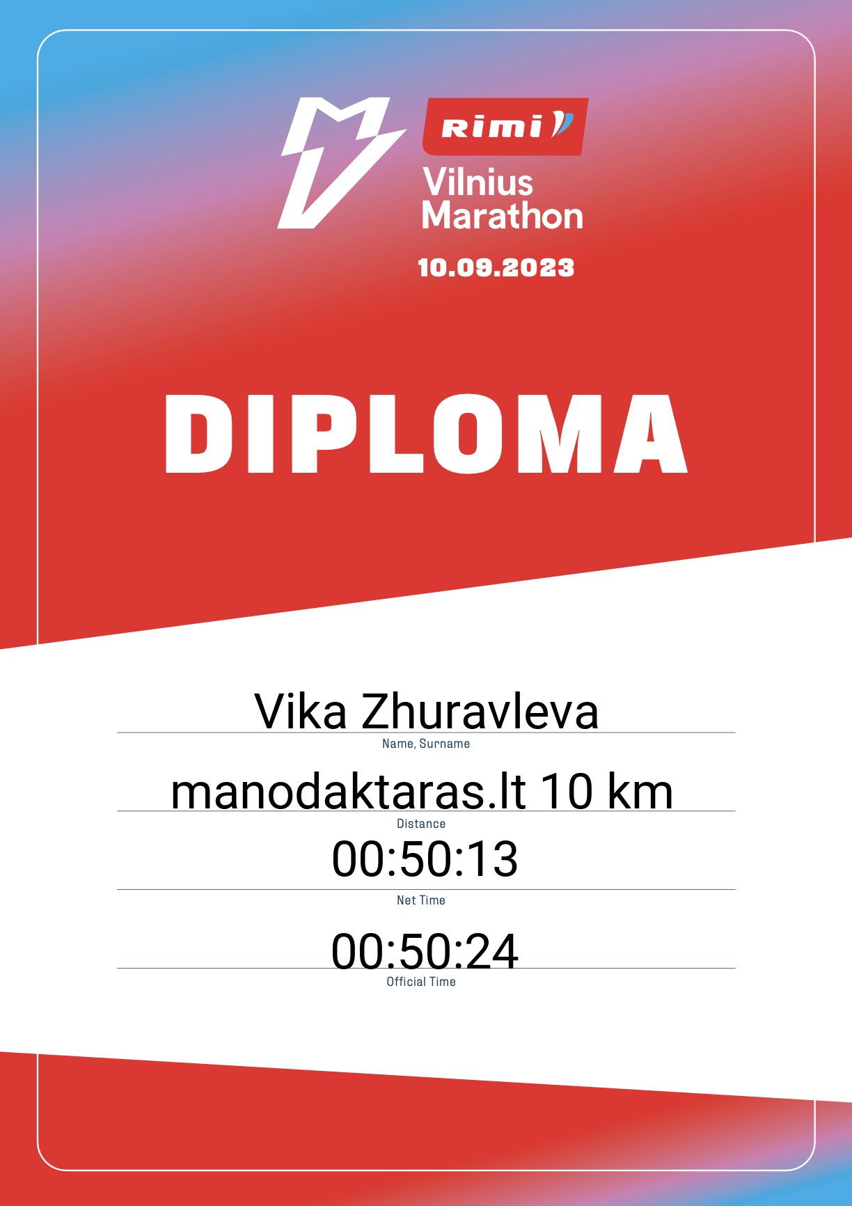 | 277 | Vika Zhuravleva | 20277 | Lithuania | manodaktaras.lt 10 km | 00:50:24 | Diplomas | |