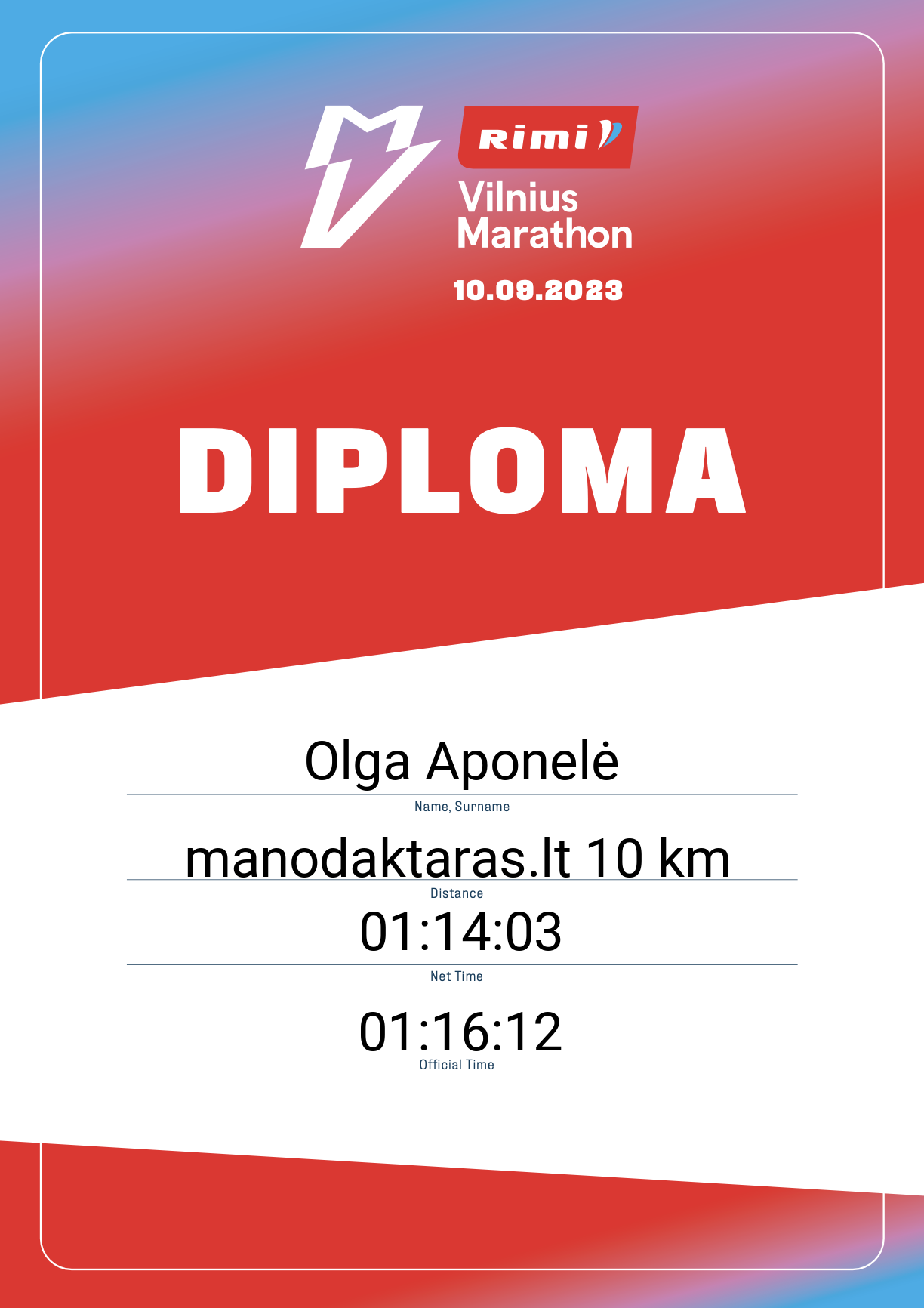 | 1891 | Olga Aponelė | 20573 | Lithuania | manodaktaras.lt 10 km | 01:16:12 | Diplomas | |