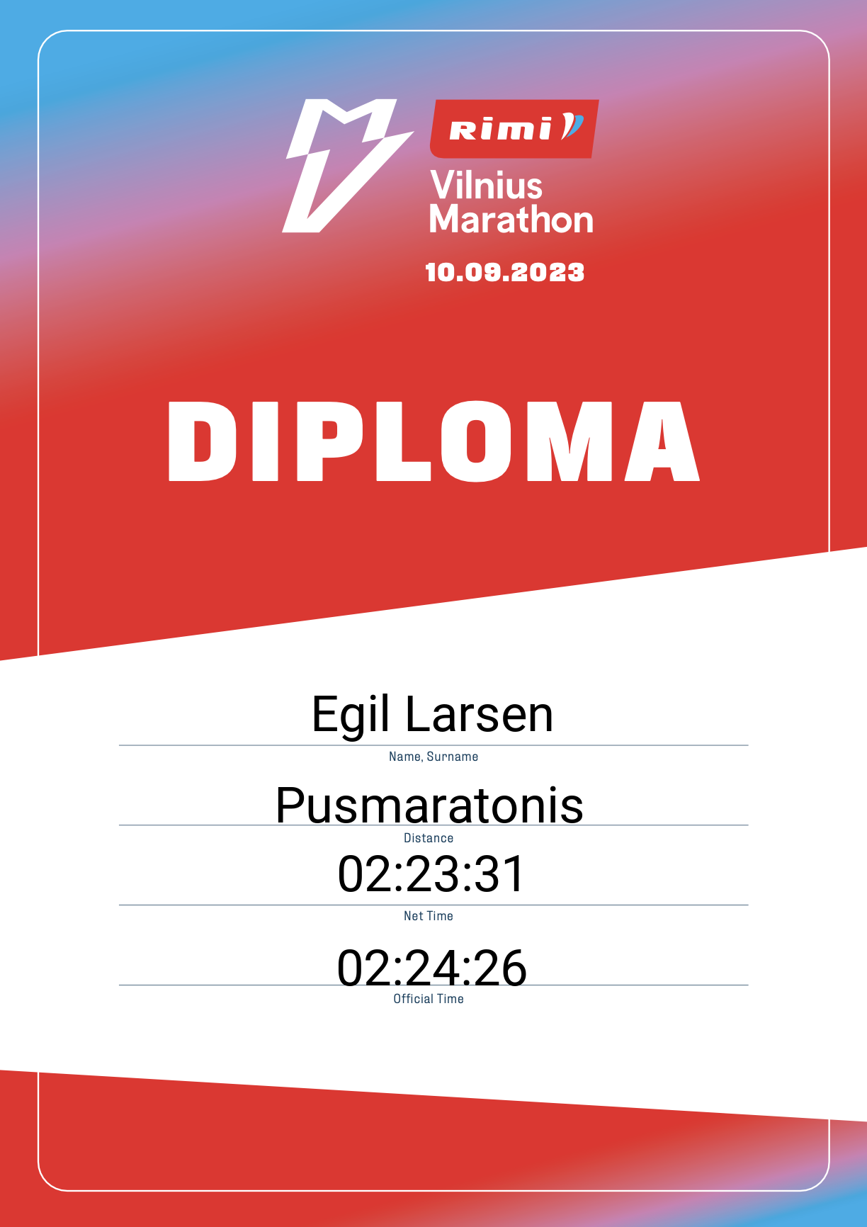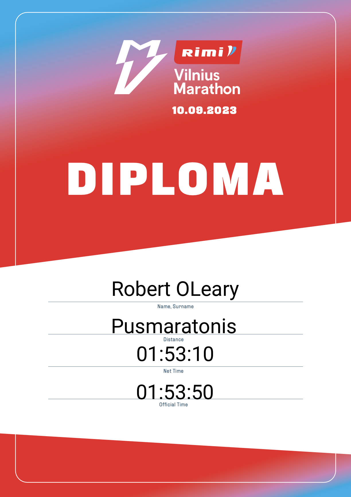 | 674 | Robert OLeary | 12765 | Lithuania | Pusmaratonis | 01:53:50 | Diplomas |