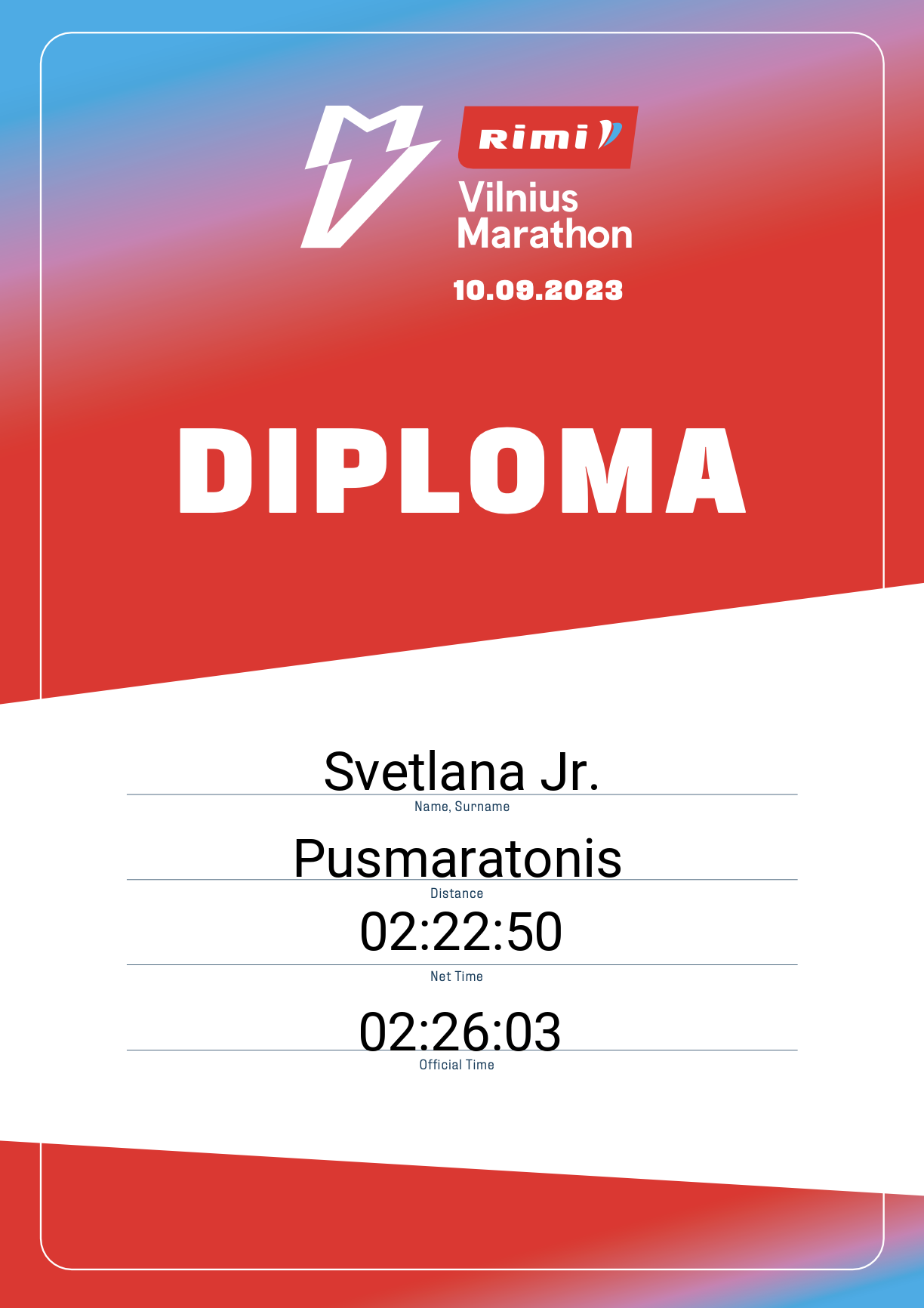 | 1569 | Svetlana Jr. | 13132 | Lithuania | Pusmaratonis | 02:26:03 | Diplomas | |