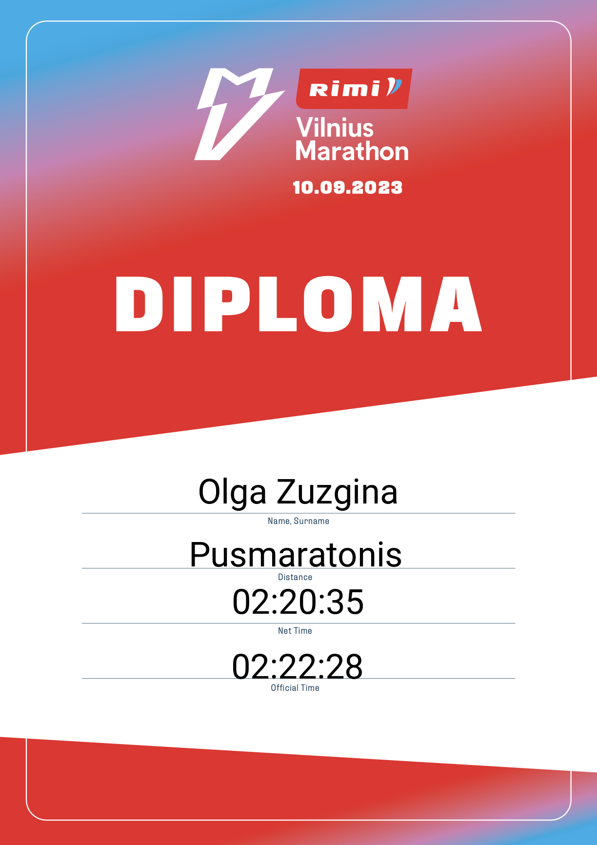 | 1521 | Olga Zuzgina | 13420 | Lithuania | Pusmaratonis | 02:22:28 | Diplomas | |