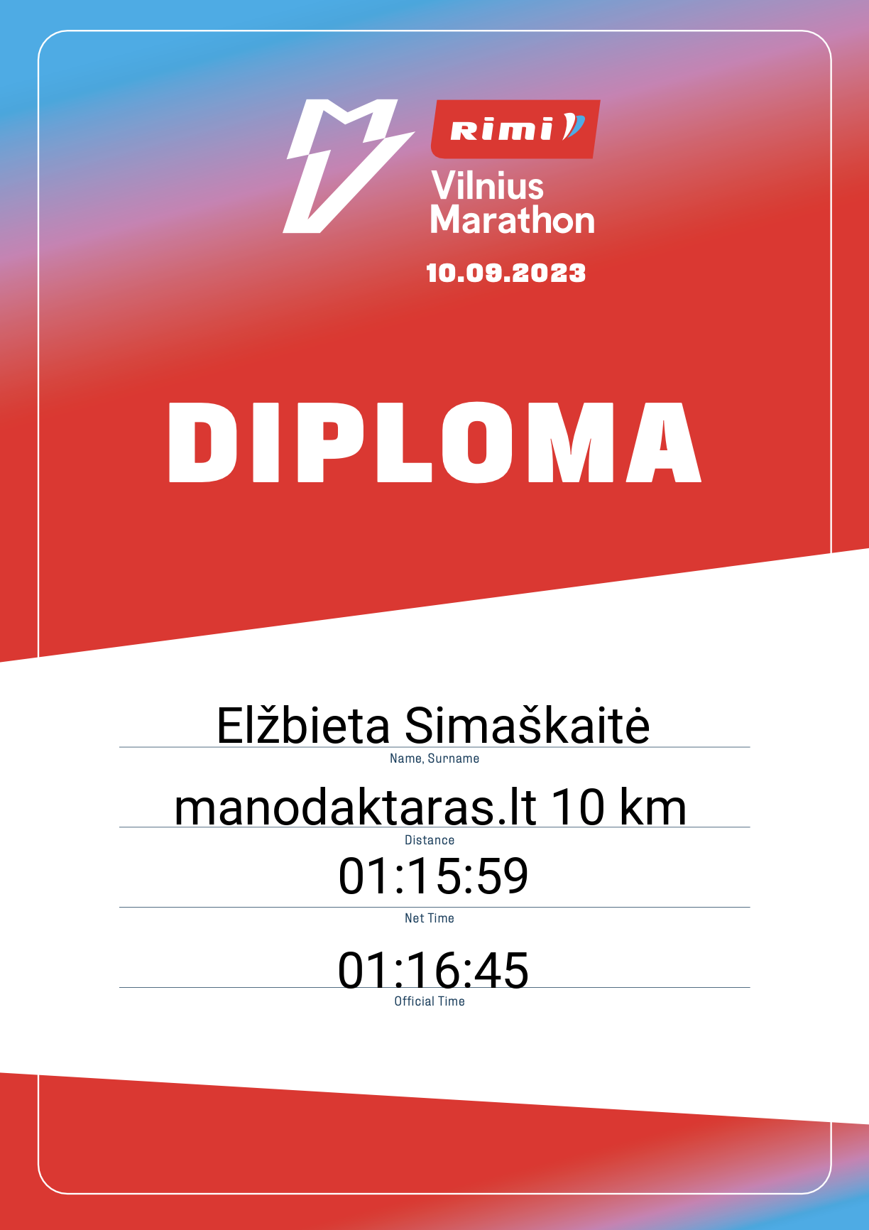 | 609 | Vaida Šimelevičienė | 21969 | Lithuania | manodaktaras.lt 10 km | 00:55:37 | Diplomas | |