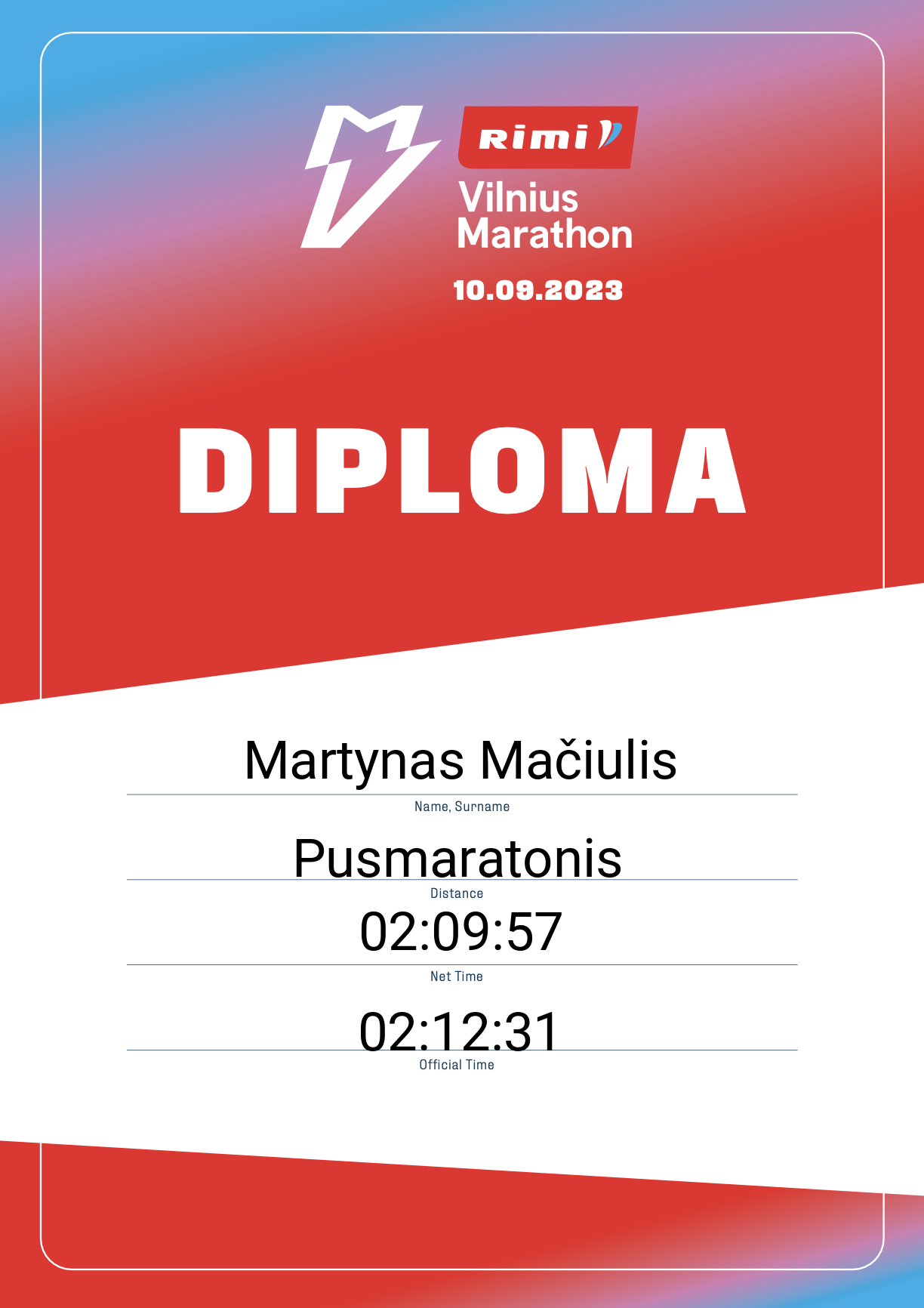 | 1335 | Martynas Mačiulis | 14008 | Lithuania | Pusmaratonis | 02:12:31 | Diplomas | |