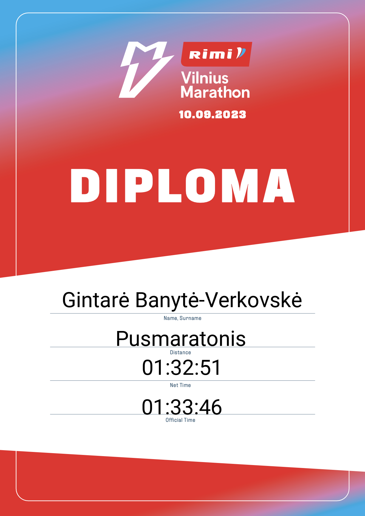 | 152 | Gintarė Banytė-Verkovskė | 13878 | Lithuania | Pusmaratonis | 01:33:46 | Diplomas | |