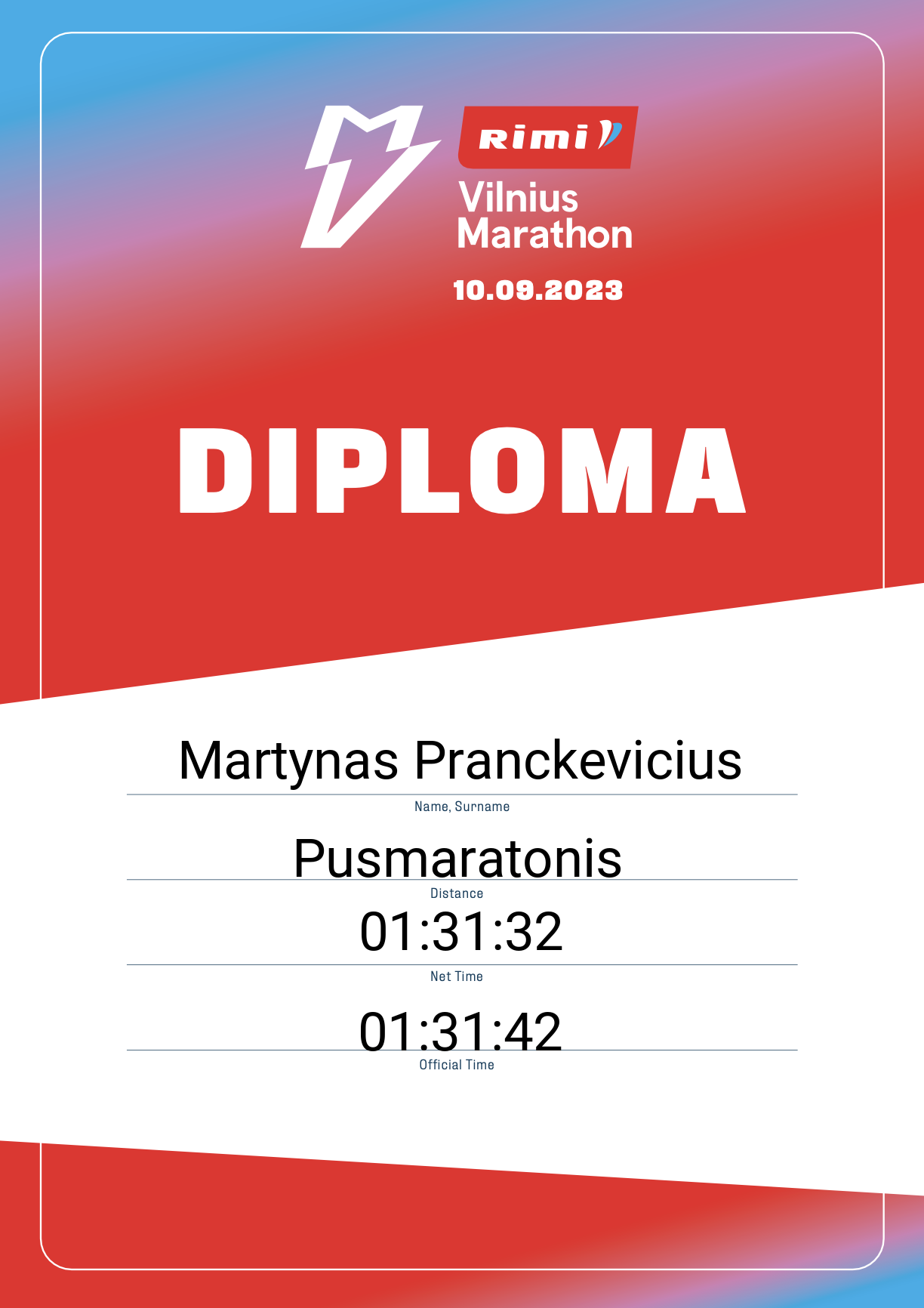 | 126 | Martynas Pranckevicius | 12966 | Lithuania | Pusmaratonis | 01:31:42 | Diplomas | |