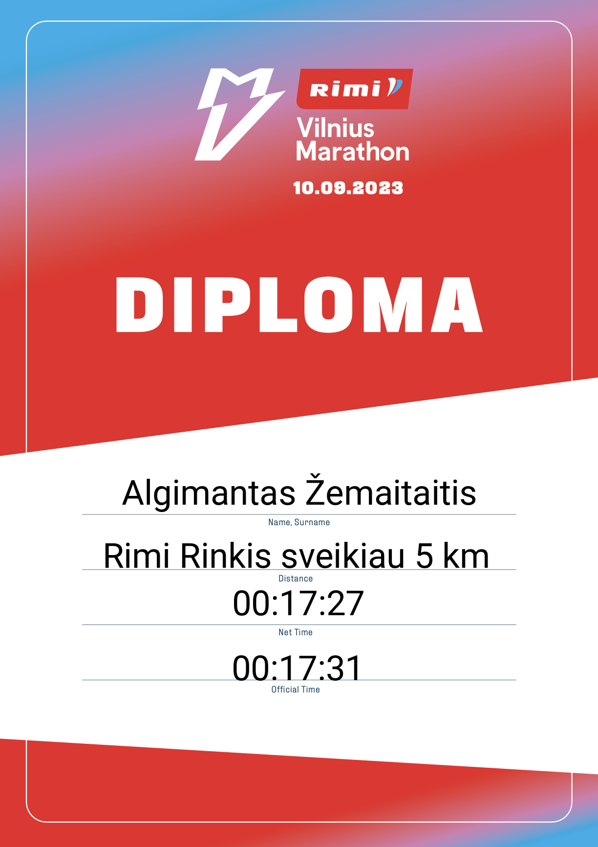 | 13 | Algimantas Žemaitaitis | "Cosma" | 32619 | Lithuania | Rimi Rinkis sveikiau 5 km | 00:17:31 | Diplomas |