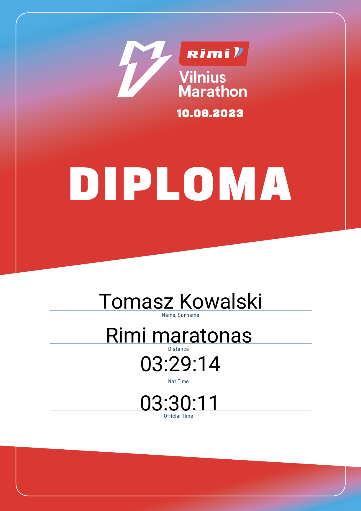 | 158 | Tomasz Kowalski | 1193 | Poland | Rimi maratonas | 03:30:11 | Diplomas | |