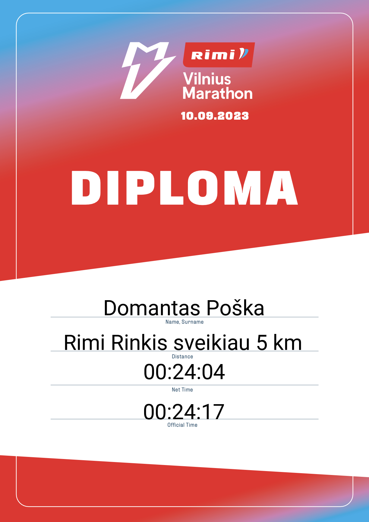 | 208 | Domantas Poška | Devbridge | 31542 | Lithuania | Rimi Rinkis sveikiau 5 km | 00:24:17 | Diplomas |