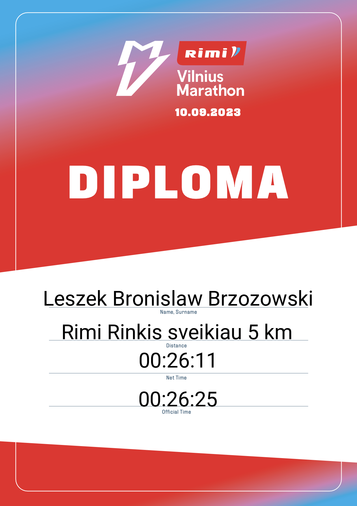 | 351 | Leszek Bronislaw Brzozowski | 33464 | Poland | Rimi Rinkis sveikiau 5 km | 00:26:25 | Diplomas | |
