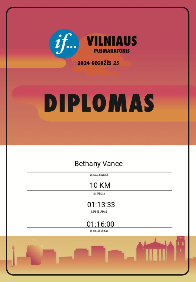 | 903 | Bethany Vance | 20178 | Lithuania | 10 KM | 01:16:00 | Diplomas | |