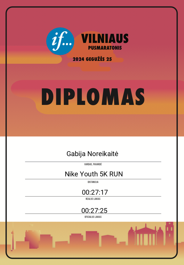 | 191 | Gabija Noreikaitė | Temple social club | 30042 | Lithuania | Nike Youth 5K RUN | 00:27:25 | Diplomas |