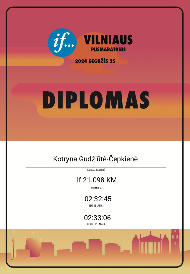 | 1257 | Kotryna Gudžiūtė-Čepkienė | 10297 | Lithuania | If 21.098 KM | 02:33:06 | Diplomas | |