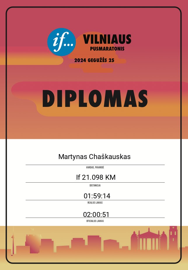 | 294 | Giedrius Virkutis | Vilniaus Bėgimo Klubas | 10871 | Lithuania | If 21.098 KM | 01:43:53 | Diplomas |