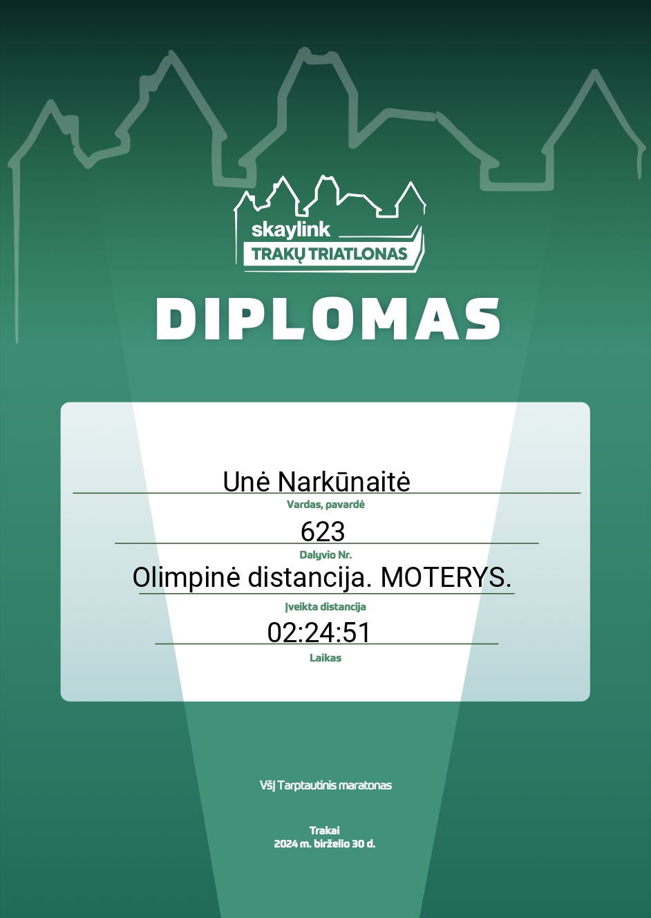 | 1 | Unė Narkūnaitė | BTT ( Best Triathlon Team ) | 623 | Lithuania | Olimpinė distancija. MOTERYS. | 02:24:51 | Diplomas |