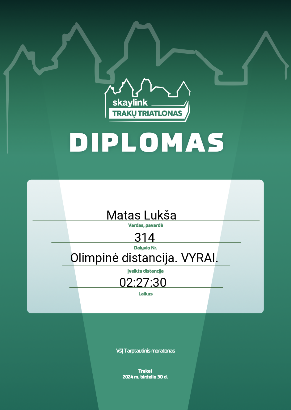 | 52 | Matas Lukša | Love Streams Running | 314 | Lithuania | Olimpinė distancija. VYRAI. | 02:27:30 | Diplomas |