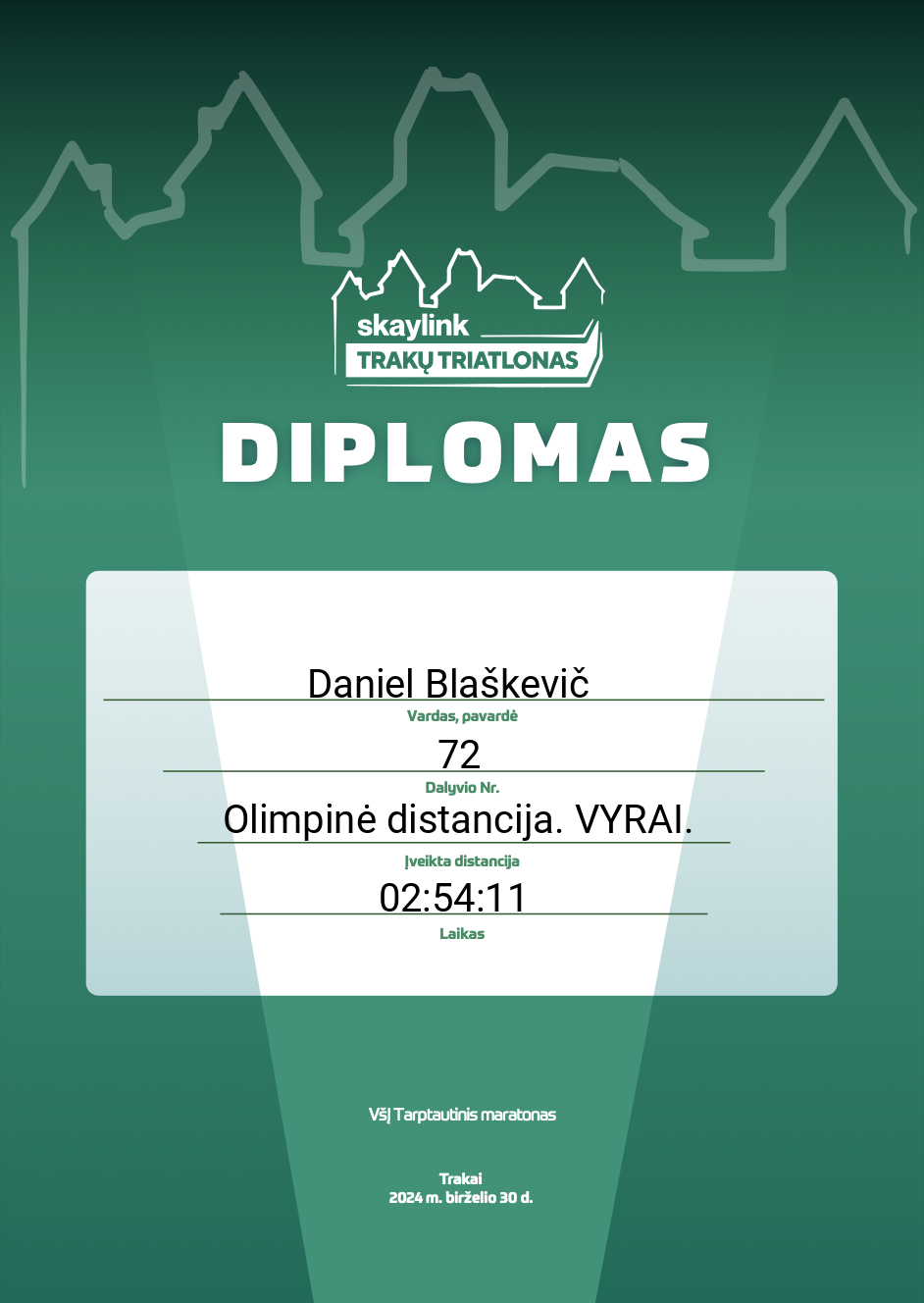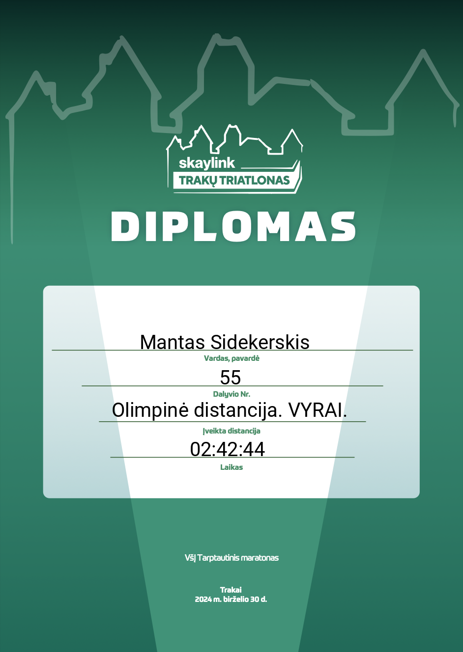 | 39 | Juozas Gerulaitis | Klaipedos Triatlono Klubas | 54 | Lithuania | Olimpinė distancija. VYRAI. | 02:25:30 | Diplomas |