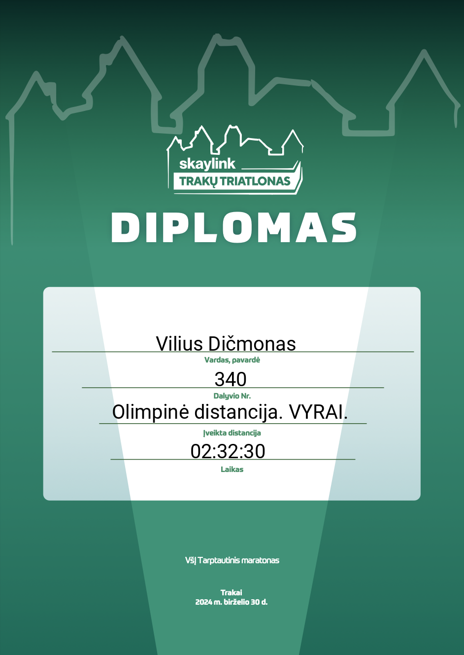 | 230 | Tadas Sirvidas | TVIRTIEMS TAURIEMS TAUPIEMS | 331 | Lithuania | Olimpinė distancija. VYRAI. | 03:14:13 | Diplomas |