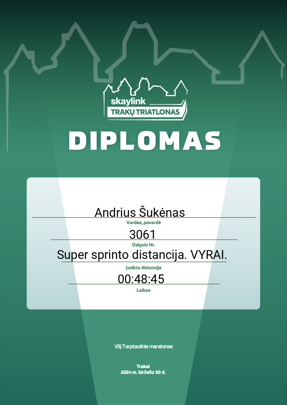 | 34 | Andrius Šukėnas | 3061 | Lithuania | Super sprinto distancija. VYRAI. | 00:48:45 | Diplomas | |