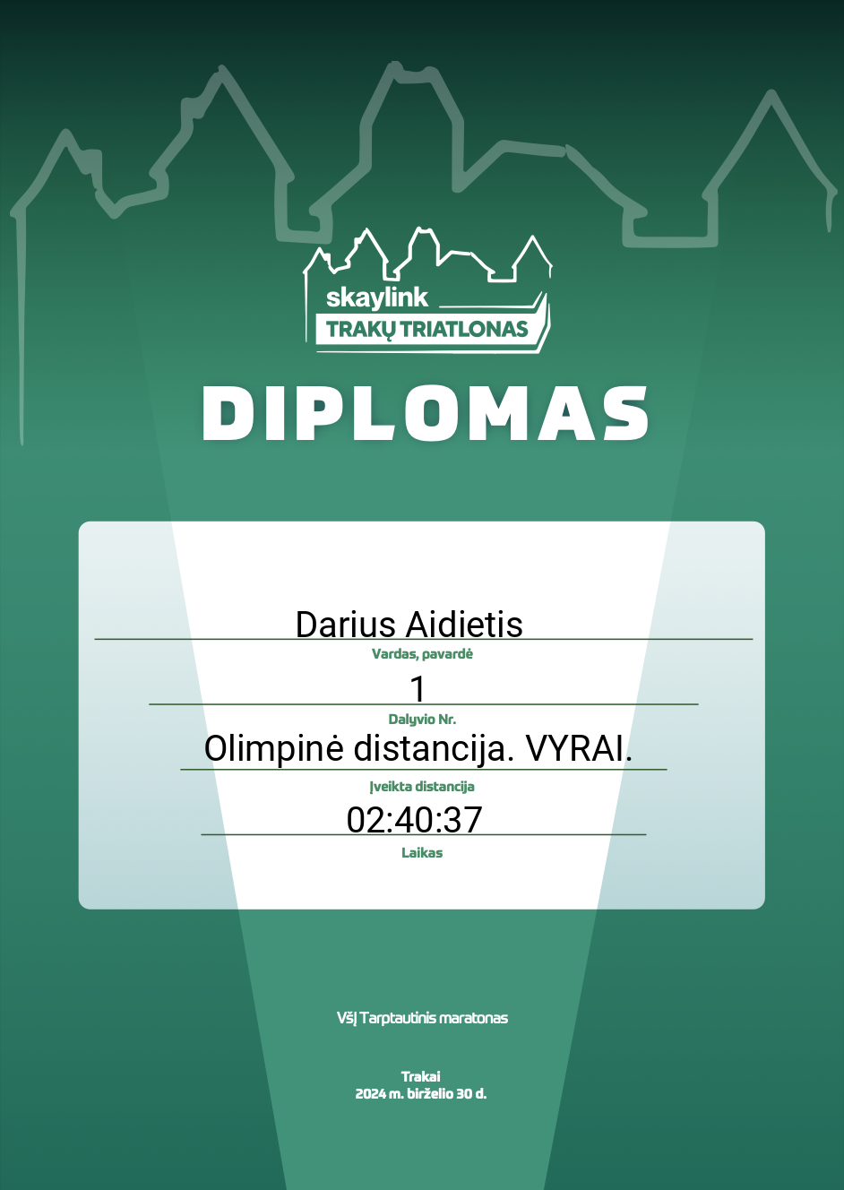 | 113 | Darius Aidietis | Focus running | 1 | Lithuania | Olimpinė distancija. VYRAI. | 02:40:37 | Diplomas |