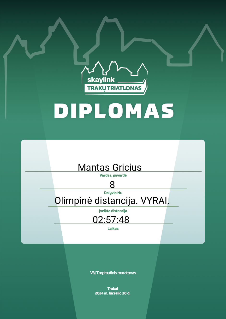 | 185 | Mantas Gricius | HighPeaks Lietuva | 8 | Lithuania | Olimpinė distancija. VYRAI. | 02:57:48 | Diplomas |