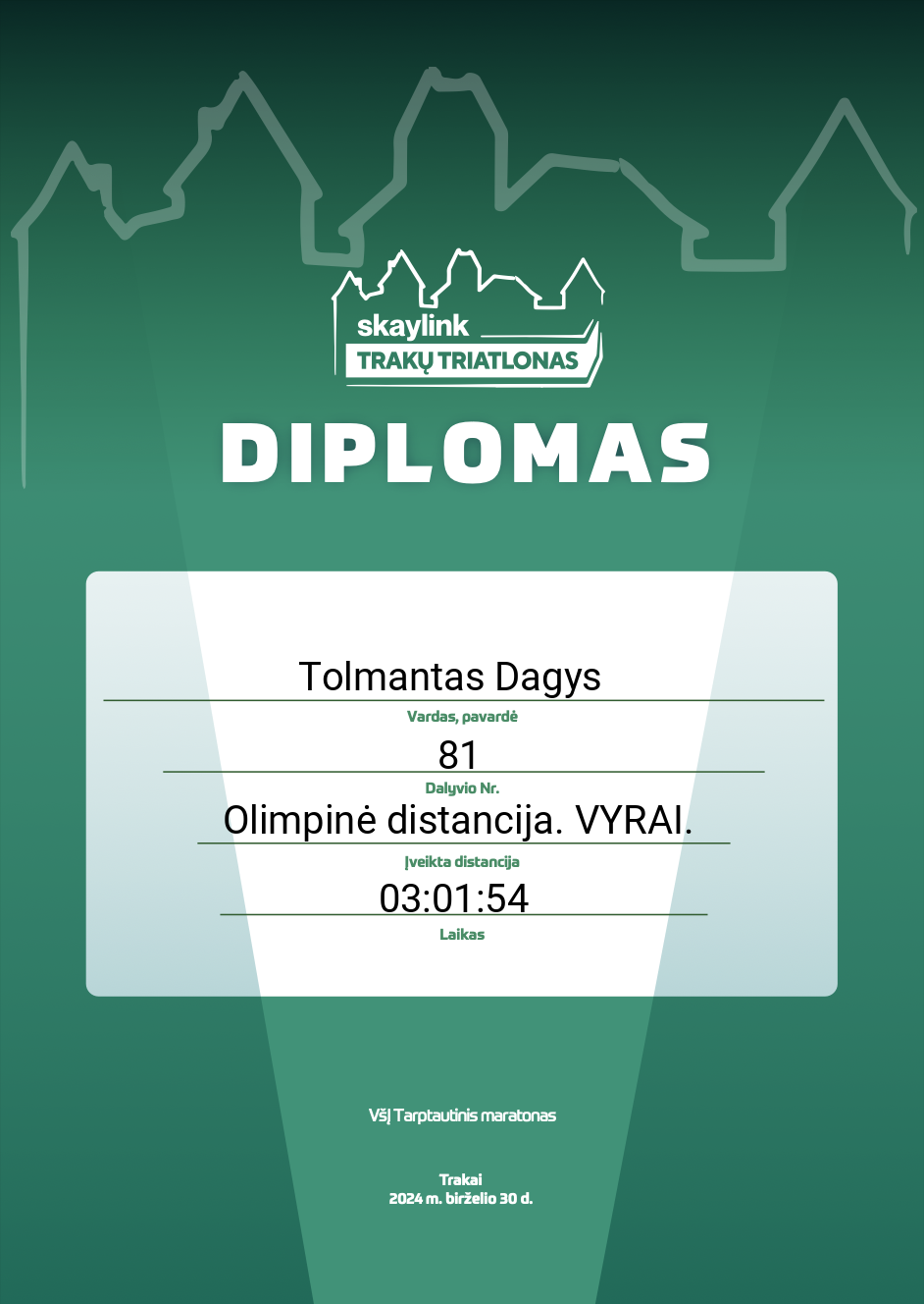 | 197 | Tolmantas Dagys | Love Streams Running | 81 | Lithuania | Olimpinė distancija. VYRAI. | 03:01:54 | Diplomas |