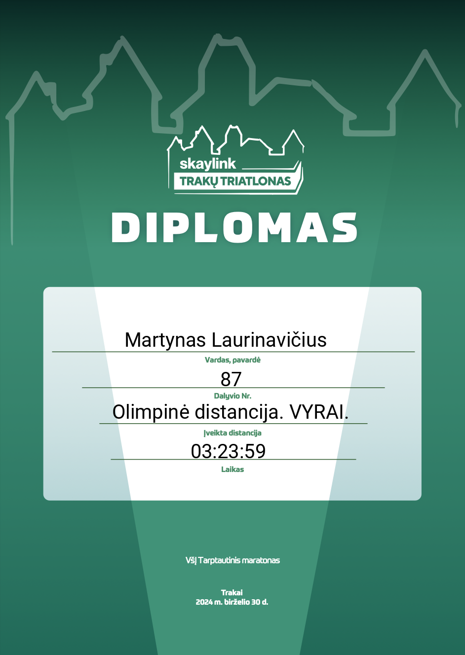 | 244 | Martynas Laurinavičius | Savarankiškas | 87 | Lithuania | Olimpinė distancija. VYRAI. | 03:23:59 | Diplomas |