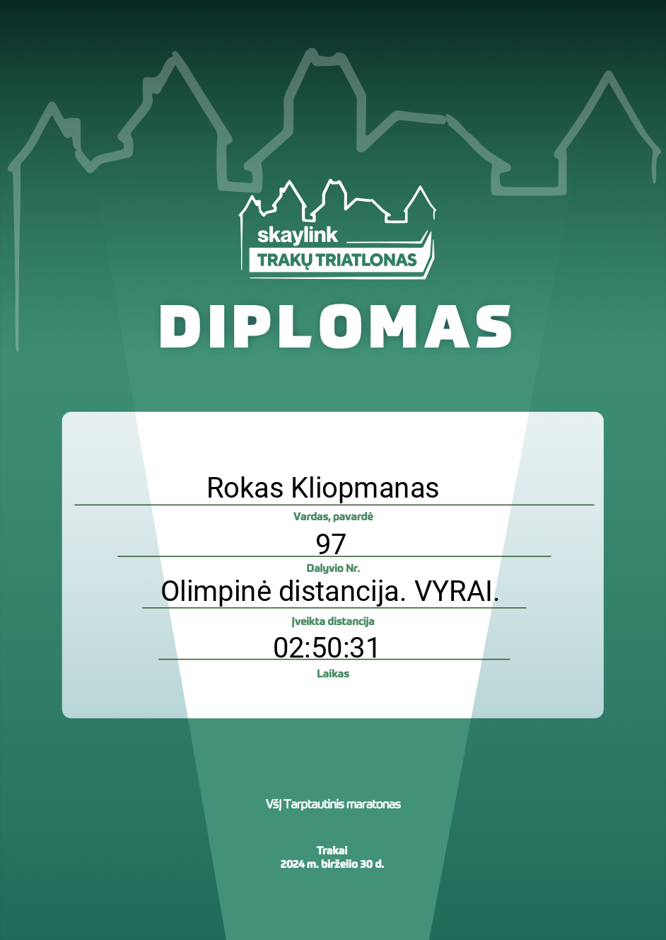 | 160 | Rokas Kliopmanas | TEMPLE Social Club | 97 | Lithuania | Olimpinė distancija. VYRAI. | 02:50:31 | Diplomas |
