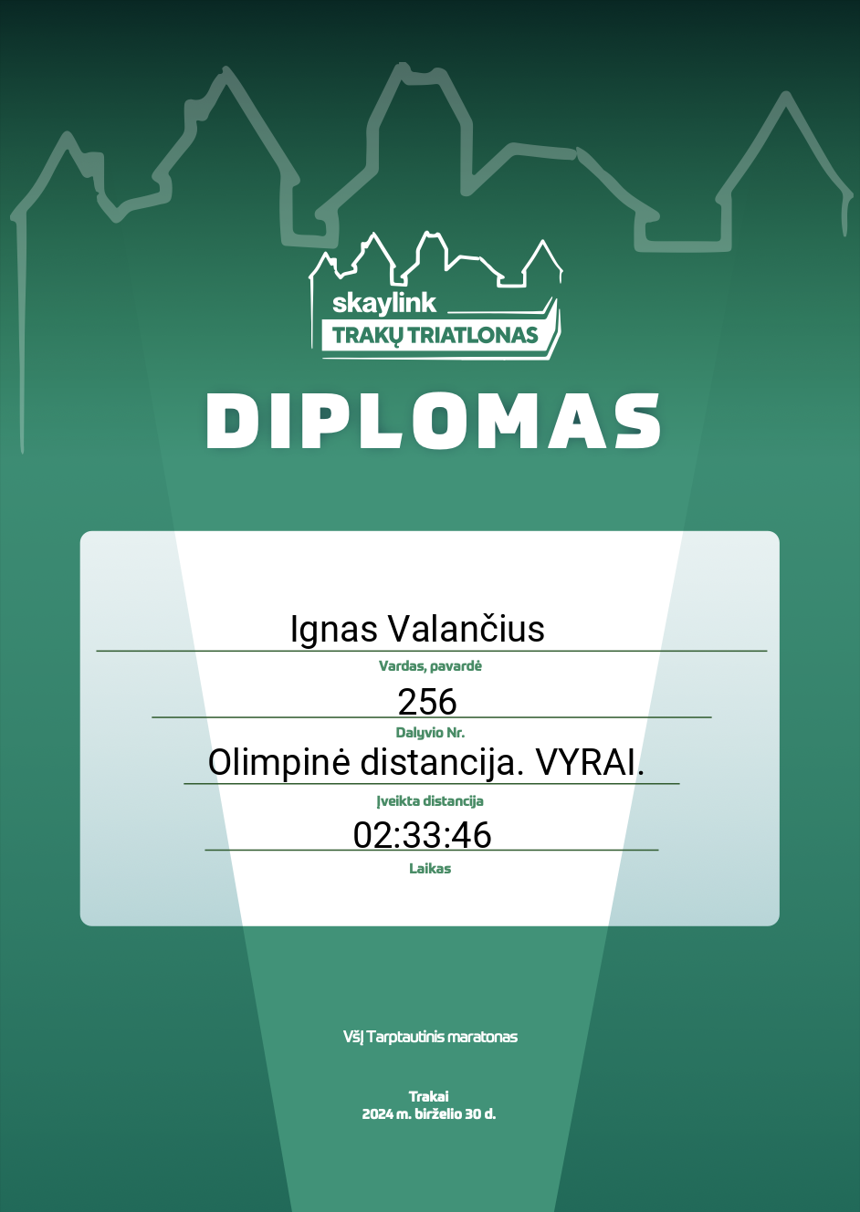 | 120 | Deividas Jančius | Kauno Triatlono Klubas | 246 | Lithuania | Olimpinė distancija. VYRAI. | 02:41:13 | Diplomas |