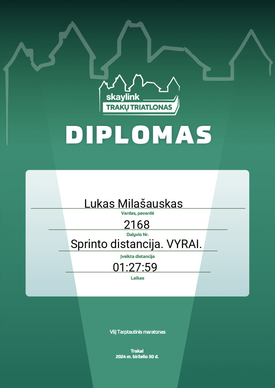 | 68 | Lukas Milašauskas | Wix | 2168 | Lithuania | Sprinto distancija. VYRAI. | 01:27:59 | Diplomas |