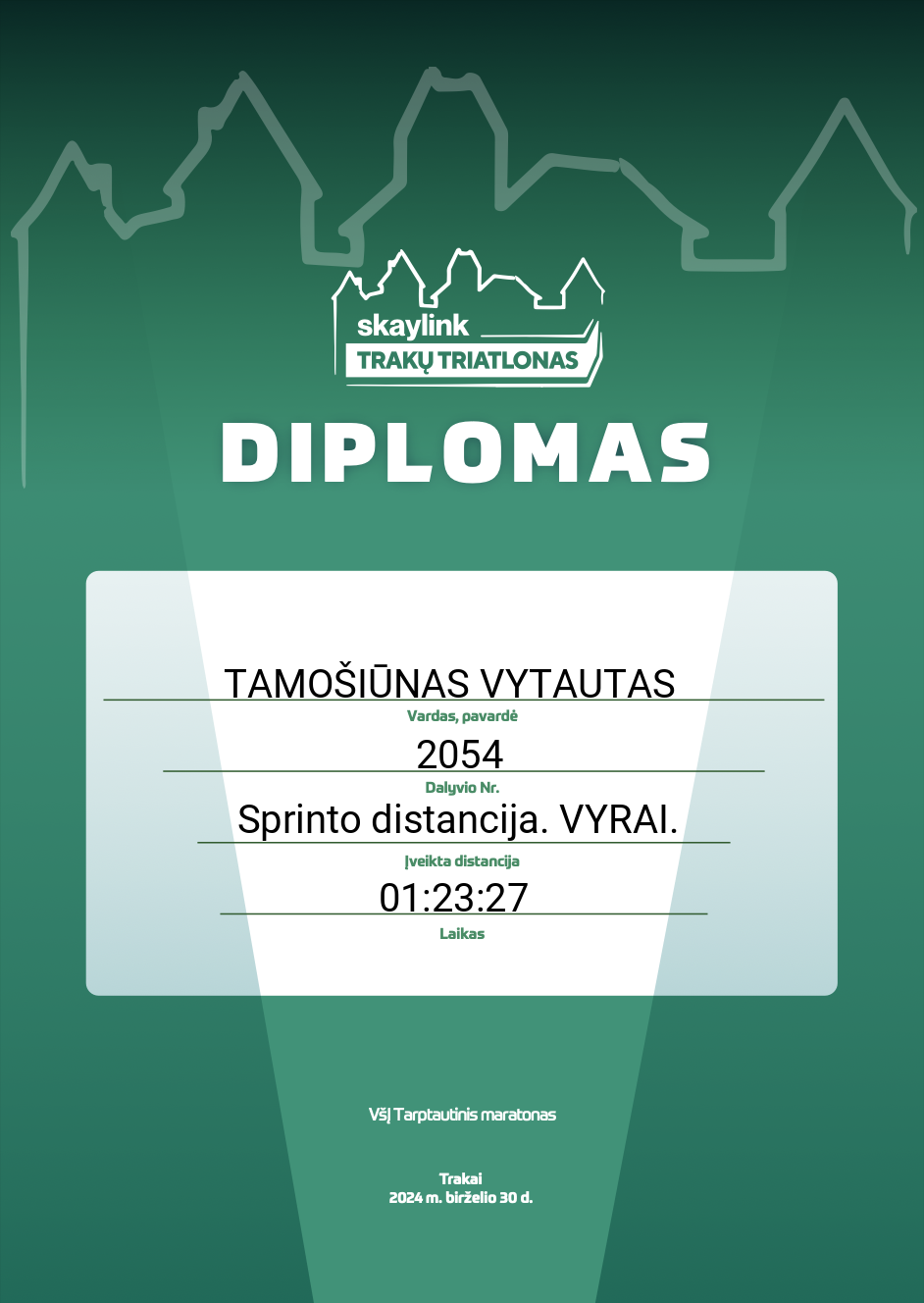 | 43 | TAMOŠIŪNAS VYTAUTAS | 2054 | Lithuania | Sprinto distancija. VYRAI. | 01:23:27 | Diplomas | |