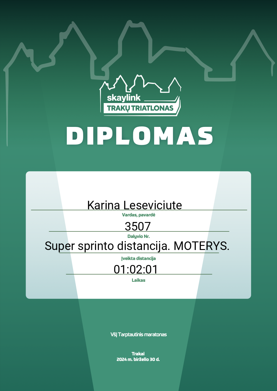 | 25 | Karina Leseviciute | 3507 | Lithuania | Super sprinto distancija. MOTERYS. | 01:02:01 | Diplomas | |