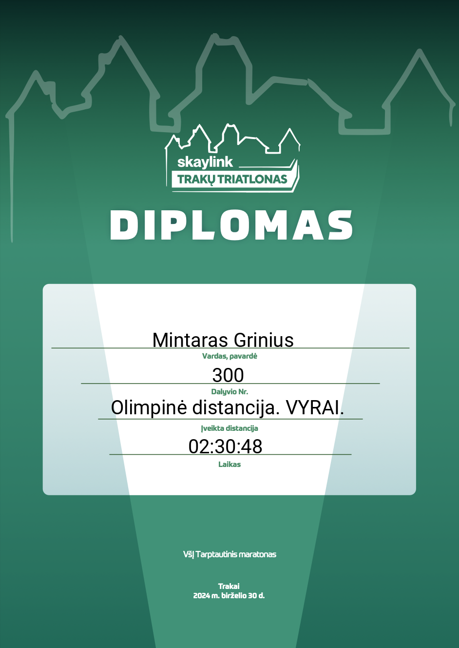 | 64 | Mintaras Grinius | 300 | Lithuania | Olimpinė distancija. VYRAI. | 02:30:48 | Diplomas | |