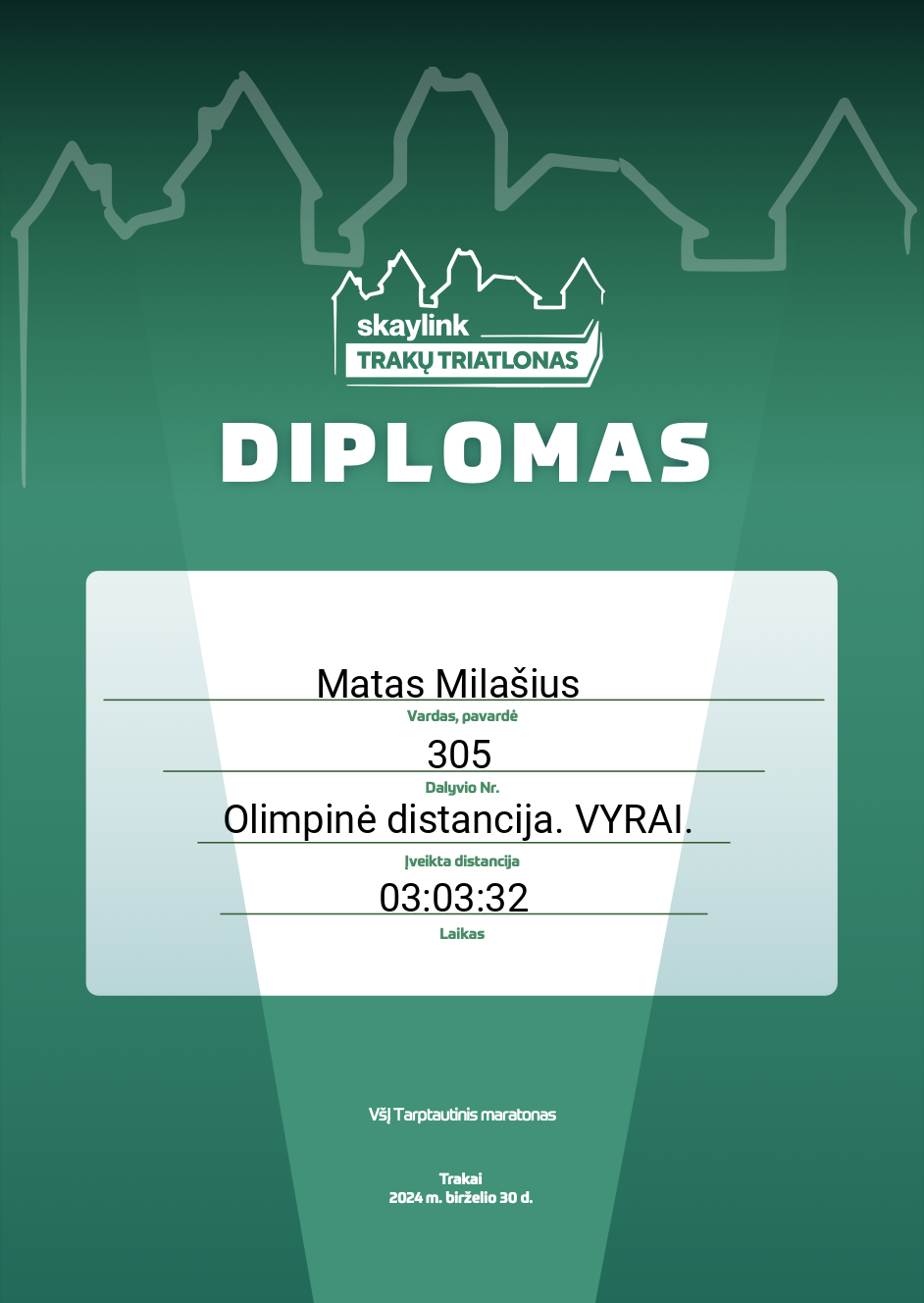 | 204 | Matas Milašius | 305 | Lithuania | Olimpinė distancija. VYRAI. | 03:03:32 | Diplomas | |