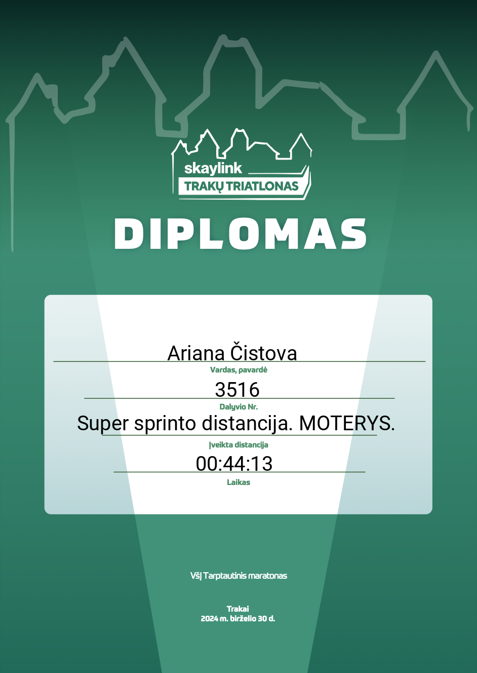 | 8 | Ariana Čistova | SSC | 3516 | Lithuania | Super sprinto distancija. MOTERYS. | 00:44:13 | Diplomas |
