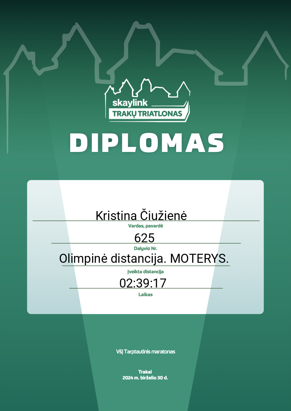 | 8 | Kristina Čiužienė | SunCity CrossFit | 625 | Lithuania | Olimpinė distancija. MOTERYS. | 02:39:17 | Diplomas |