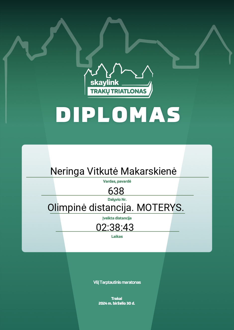 | 7 | Neringa Vitkutė Makarskienė | Klaipėdos Triatlono Klubas | 638 | Lithuania | Olimpinė distancija. MOTERYS. | 02:38:43 | Diplomas |
