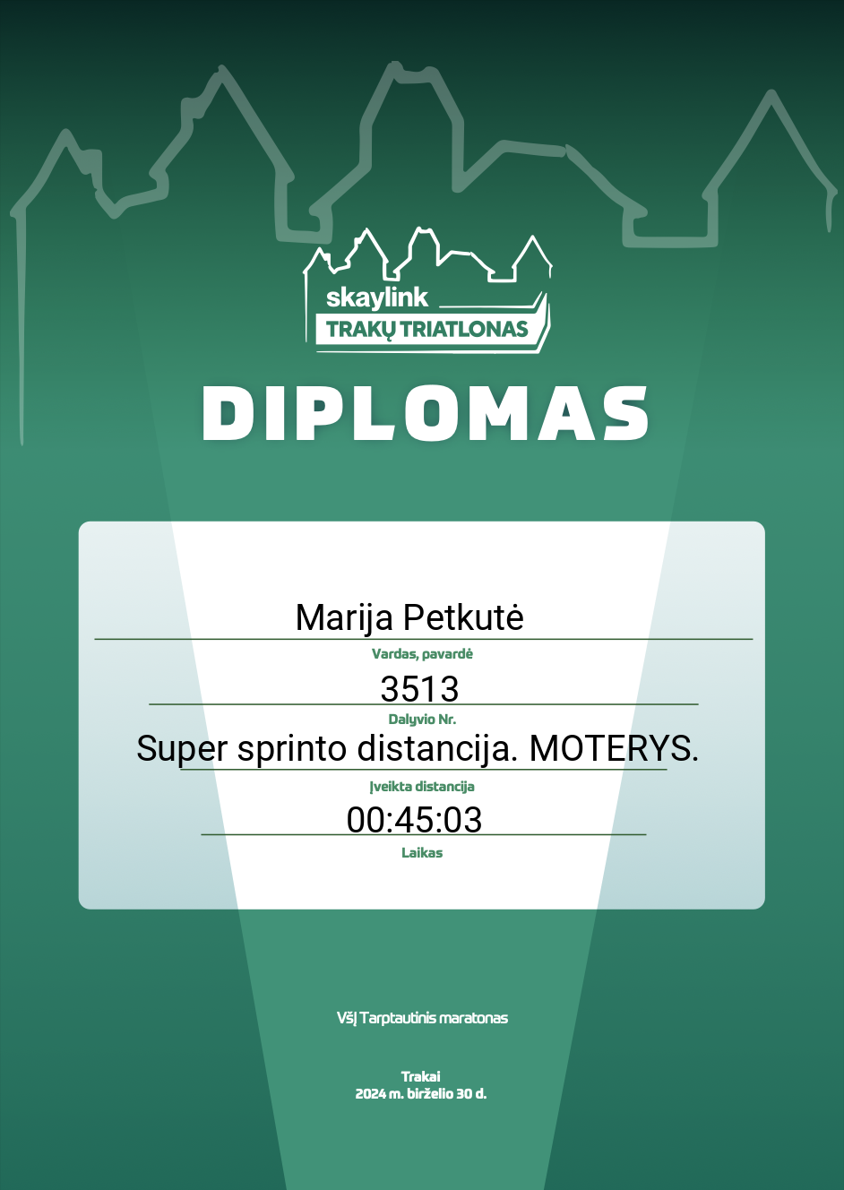10 Aistė Alda Kasinskienė TRItonas 3517 Lithuania Super sprinto distancija. MOTERYS. 00:45:57 00:10:45 00:01:41 00:19:57 00:01:12 00:12:20 Diplomas
