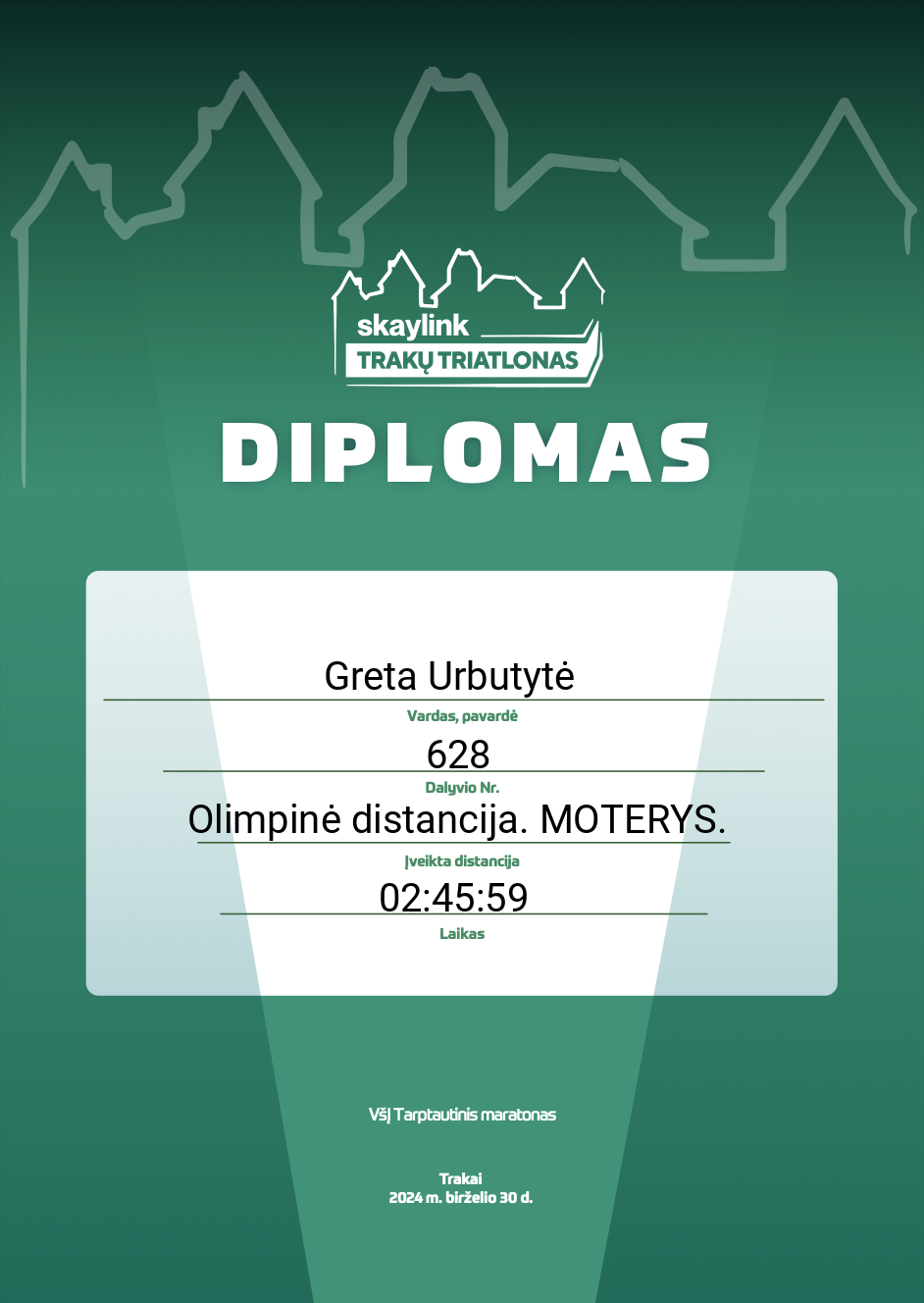 10 Greta Urbutytė Trakų Triatlono Būrelis 628 Lithuania Olimpinė distancija. MOTERYS. 02:45:59 00:34:21 00:02:26 01:20:06 00:11:38 00:12:01 00:12:06 00:01:45 00:47:21 00:11:35 Diplomas
