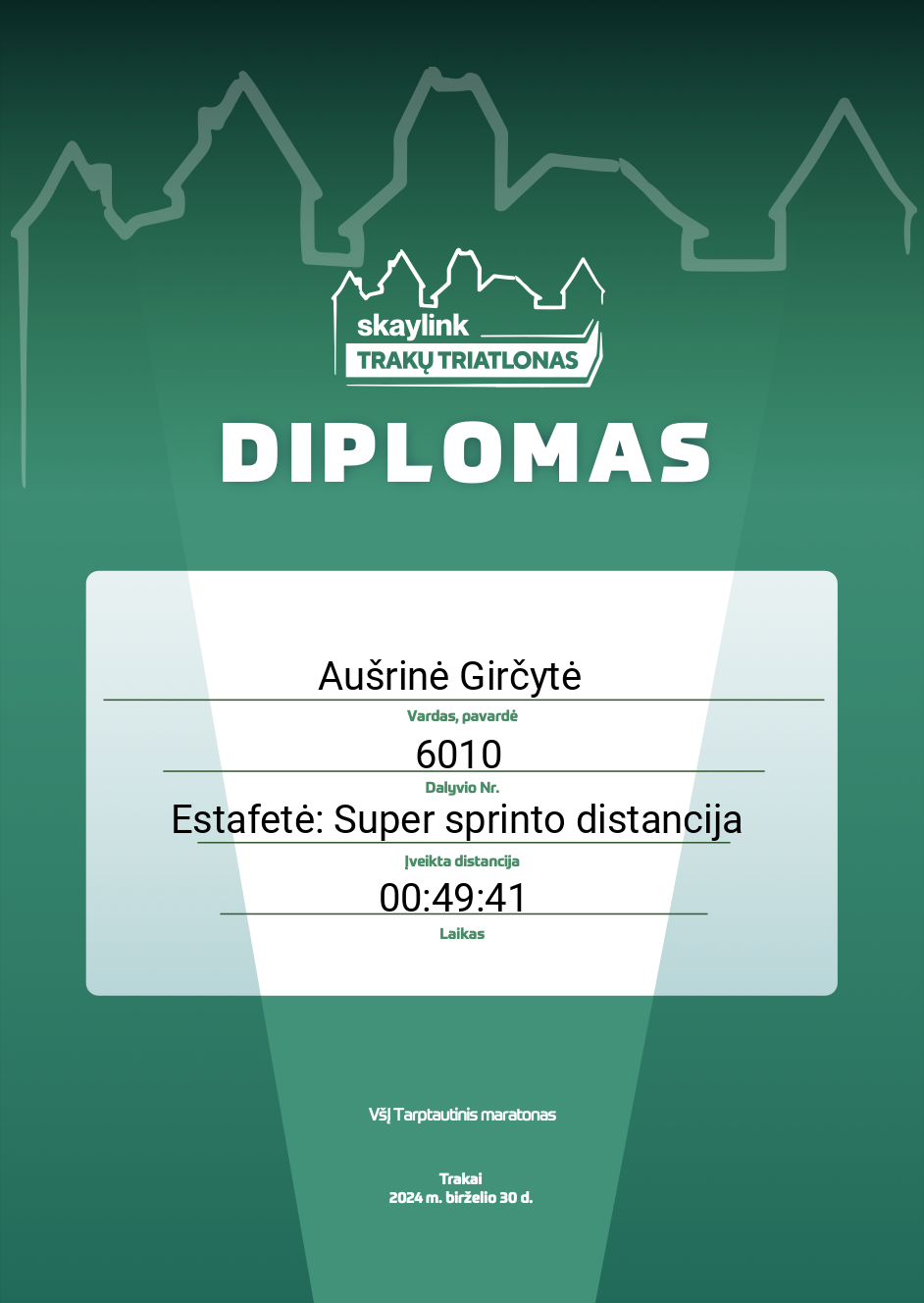9 Aušrinė Girčytė Klaipėdos Triatlono klubas 6010 Lithuania Estafetė: Super sprinto distancija 00:49:41 00:11:33 00:00:48 00:23:44 00:00:43 00:12:53 Diplomas