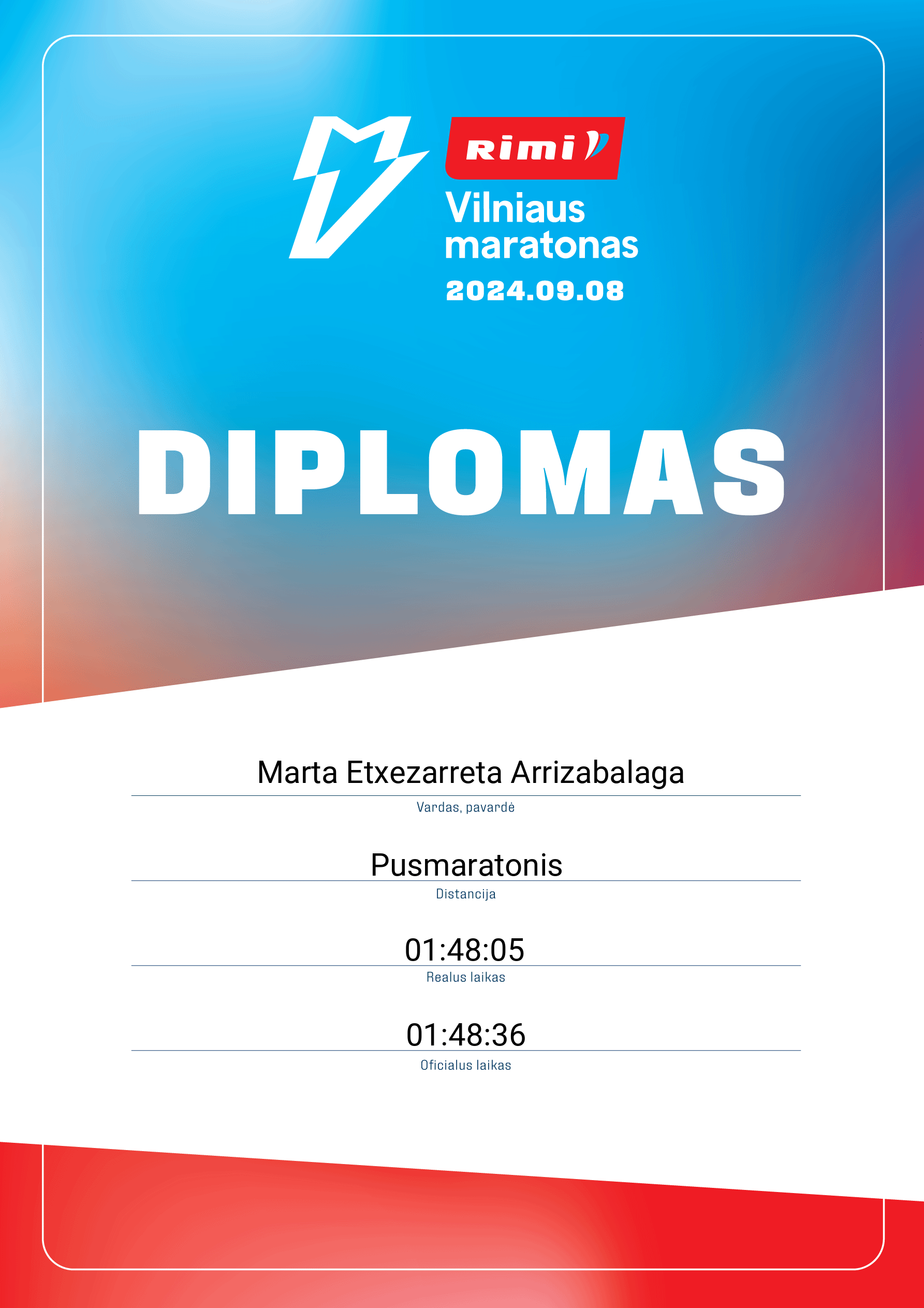 | 611 | Marta Etxezarreta Arrizabalaga | 10367 | Lithuania | Pusmaratonis | 01:48:36 | Diplomas | |